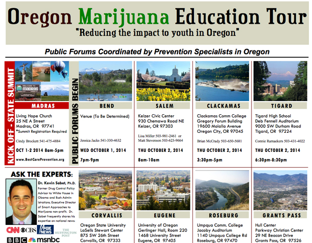 The uproar has already resulted in some cancellations and other changes to the schedule (above). Currently, it's not known which dates are still on or what venues are being used. The question of who is actually coordinating things on the ground in Oregon is even somewhat up in the air. The original flyer for the “Oregon Marijuana Education Tour,” including a list of events from Oct. 1-7, is posted here.