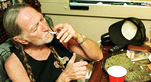 Famopus photo of Willie Nelson smoking a joint on his tour bus.