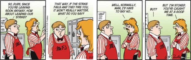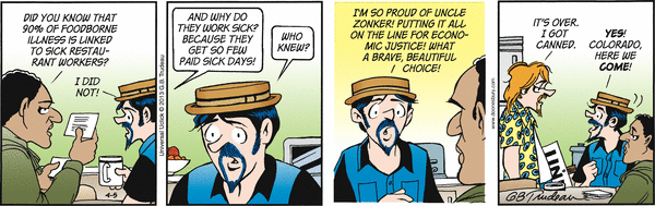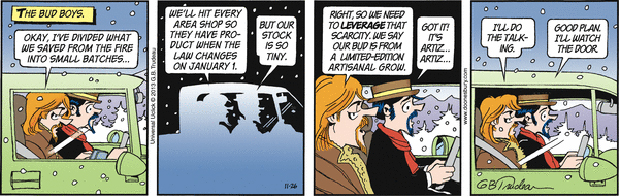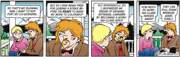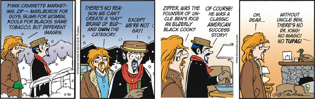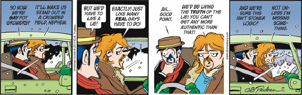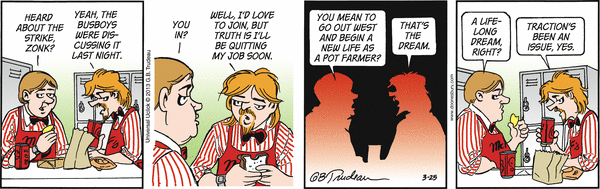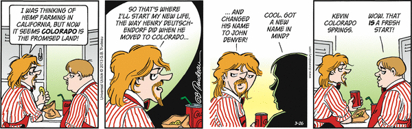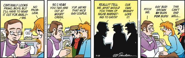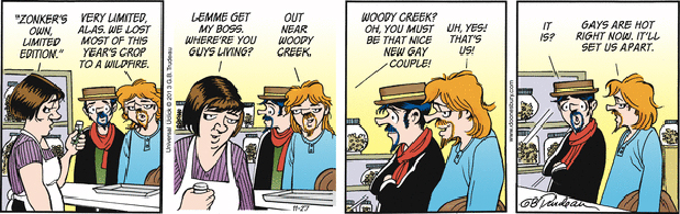 In this series of Doonesbury comic strips by Garry Trudeau, Zonker says he's changing his name to Kevin Colorado Springs and plans to start growing "artisanal cannabis." His idea is to market a brand of pot to gay stoners.