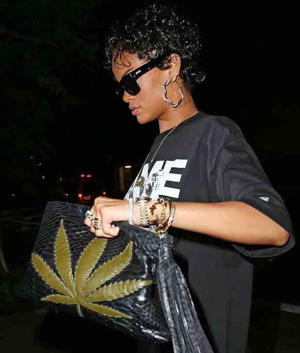 Rihanna's Pot Leaf Pocketbook Steve Bloom August 15, 2013 Tweet Rihanna's latest marijuana accessory is a pot leaf pocketbook. She was snapped with it in New York on Monday. (Photo courtesy of Splash News) See more of the latest CelebStoner news! × You May Also Like Rihanna: High Fashionista Spliff City: Rihanna in Amsterdam Rihanna Is a Top CelebStoner Rihanna's 4/20 Cake Steve Bloom Publisher of CelebStoner.com, former editor of High Times and Freedom Leaf and co-author of Pot Culture and Reefer Movie Madness. Read more by Steve Bloom