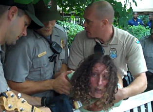 After a long discussion with Park Police about her right to remain in Independence Park with her banjo, Yates was grabbed by four officers and cuffed as she screamed, "Help! Help!" and cried, "I haven't done anything illegal!"