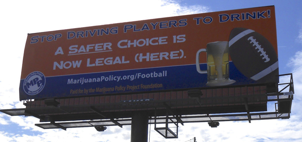 They've purchased billboard space adjacent to Denver's Sports Authority Field, where the Broncos opened the season on Sept. 5. "Stop driving players to drink!" the billboard, adorned with a mug of beer and a football, reads. "A safer choice is now legal (here)."