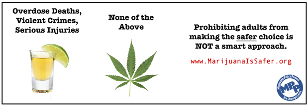 In the opposing corner (yeah!), the MPP's ad contends marijuana causes no "overdose deaths, violent crimes, serious injuries" and is "the safer choice" over alcohol (and football).