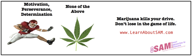In this corner (boo!), SAM's ad claims marijuana users lack "motivation, perseverance, determination" and "lose in the game of life."