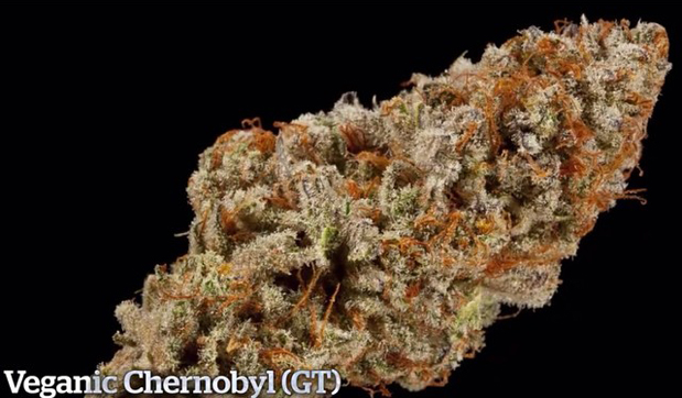 Aaron Justis from Buds & Roses tells CelebStoner: "Chernobyl is White Walrus and we entered as a sativa. It's pretty strong and inspiring with a good head high. We entered the phenotype nicknamed 'golden ticket,' that's why it's Veganic Chernobyl (GT). Mr. Tusk is a Kens OG Kush phenotype we nicknamed Purple Drank because of its aroma and flavor. It's an indica on the heavy side."