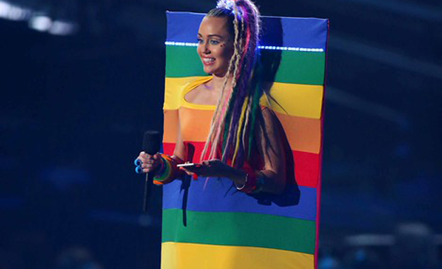 4 and 5. Dressed in a rainbow flag, Cyrus held an unlit joint in her hand. She also instructed a group of people to say "Marijuana!" in a selfie pose during the show.