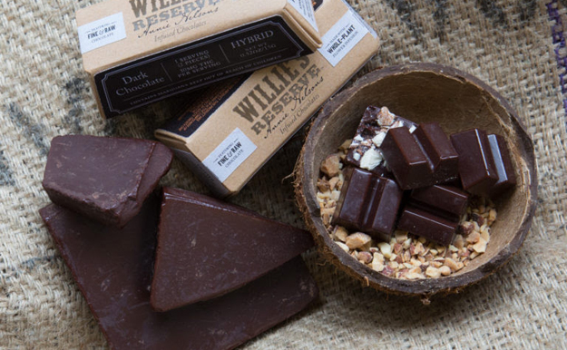 The fair-trade chocolate is made by Fine & Raw, whose mission is "to save the world through silliness and chocolate." Their "low heat technique [keeps] the chocolate's raw vitality and flavor." All ingredients are organic.
