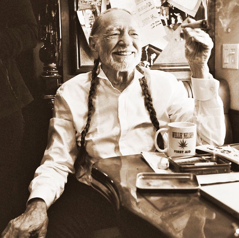 Willie Nelson posed for the above photo in his tour bus holding a large cannabis stogie. Posted at the Willie's Reserve Twitter page, it reads: