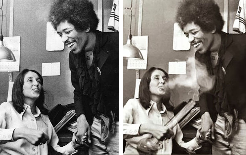 Not every musician is a pot smoker. Look no further than Joan Baez, whose doctored photo of her hitting a bong in the company of Jimi Hendrix is making another viral run through social media, mostly on Facebook. The "shopped" version of the photo first appeared in 2013.