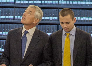 His father as appointed Secretary of Defense by Pres. Obama and took office in February. He's the former Republican Senator of Nebraska.