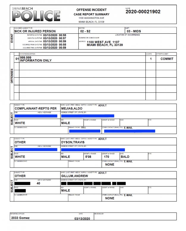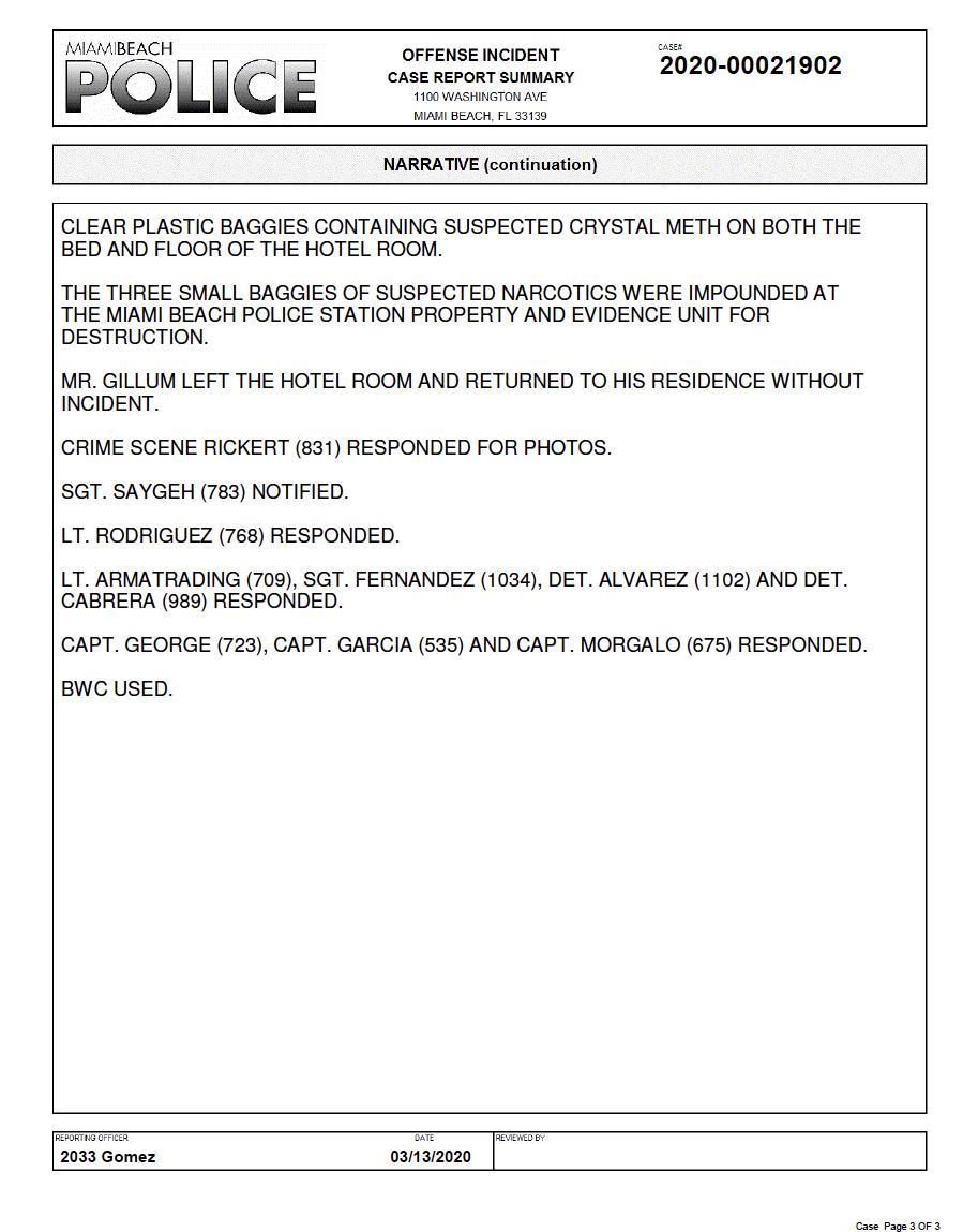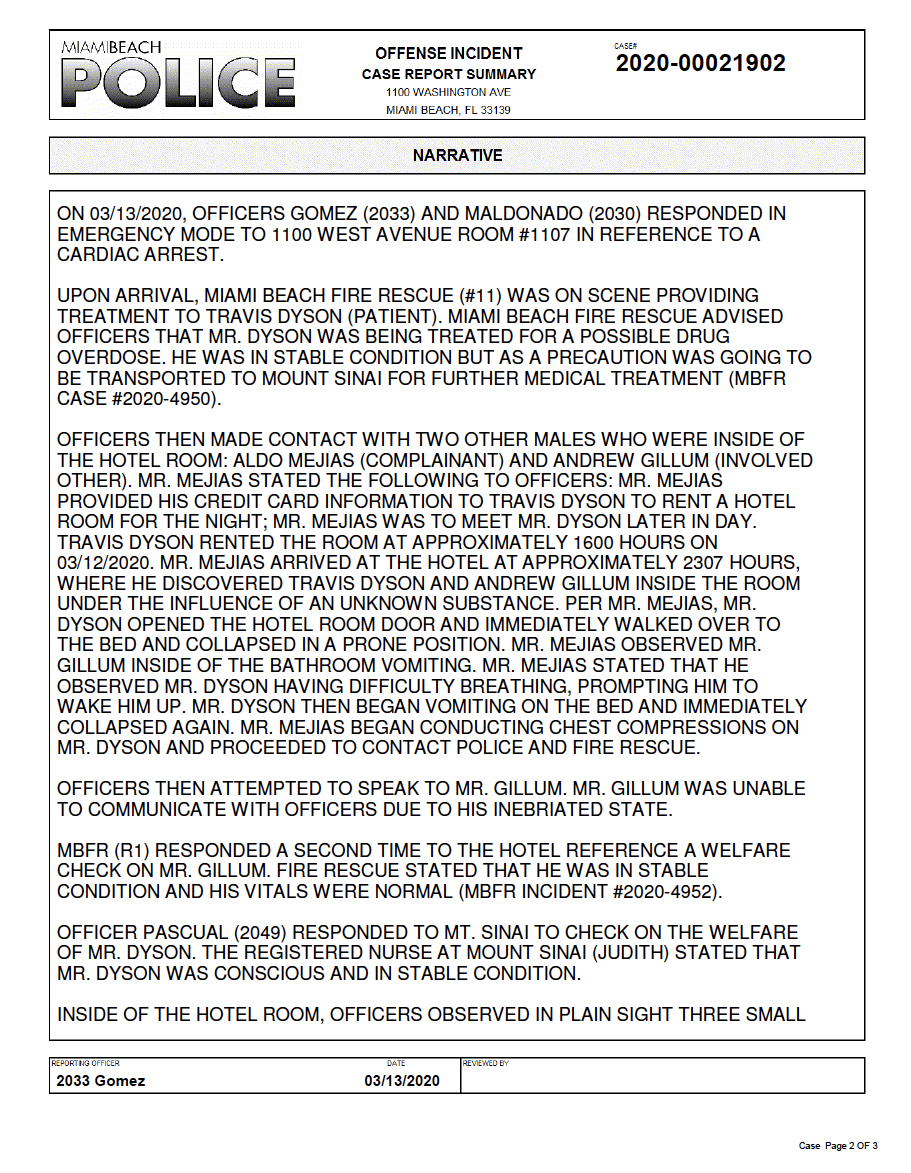 According to the Miami Beach Police incident report (see three pages below), Mejias said Gillum and Dyson were "inside the hotel room under the influence of an unknown substance." Gillum, the report noted, "was unable to communicate with officers due to his inebriated state."