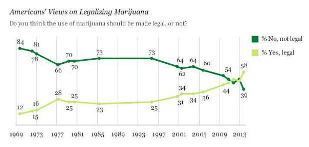 A record high number of Americans now think marijuana should be legalized. According to the latest Gallup poll, the spread is 58% for and 39% against.