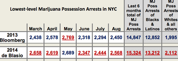 During his campaign, deBlasio opposed the stop-and-frisk policy that leads to the vast majority of pot arrests. "I would instruct the NYPD (to) stop arresting people for displays of small amounts," he maintained. "It doesn't make us safer." De Blasio added on his website, "Low-level marijuana possession arrests have disastrous consequences for individuals and their families."