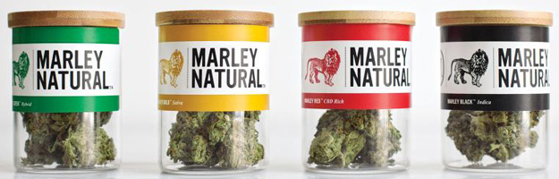 The strains are color-coded at the Marley Natural site: Marley Green (hybrid), Marley Gold (saliva), Marley Black (black) and Marley Red (CBD-rich).