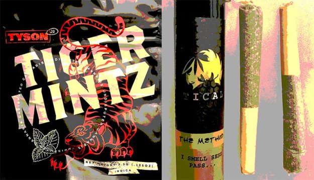Terp Bros has a a mini preroll two-pack of The Method (18% THC) for $20 and three Tyson strains (eighths for $52): Tiger Mintz, Dynamite Cookies and Knockout OG (all indicas, grown by Hudson Cannabis). I asked for the brightest green flower; Tiger Mintz (30% THC) was recommended. The total with tax was $81.36.