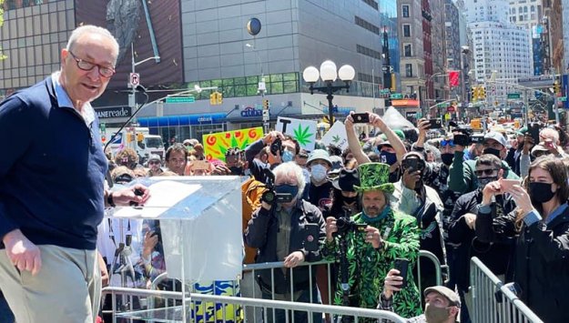 Since 1973, New York marijuana activists have gathered in a park on the first Saturday in May. What was originally called the Smoke-In is now known as the NYC Cannabis Parade & Rally. The 2021 event took place despite strict Covid-19 regulations. After the traditional parade, people assembled in Union Square Park for a rally featuring Sen. Chuck Schumer and other public officials.