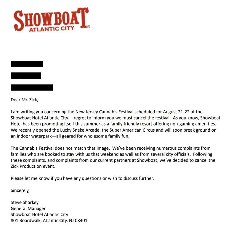 "The Cannabis Festival does not match that image. We've received numerous complaints from families that are booked to stay with us that weekend as well as from several city officials. Following these complaints and complaints from our current partners at Showboat, we've decided to cancel the Zick Productions event."
