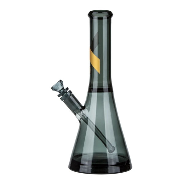 Featuring a “tinted” (smoked) transparency and made from handblown borosilicate, it’s both durable and aesthetic, utilizing a traditional beaker neck design, tapering upward. A thick re-enforced base provides a sturdy foundation to prevent tipping and accidental spills.