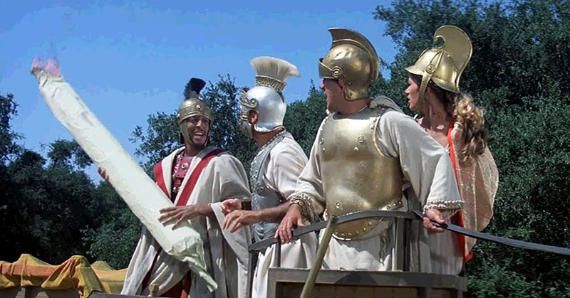 History mocks numerous eras such as the Spanish Inquistion, the French Revolution and the Stone Age. But it's the Roman Empire section of the film that makes it a stoner movie.