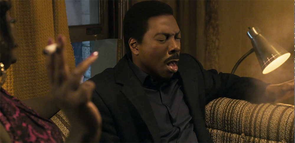 In a flashback, King Akeem (Eddie Murphy) smokes a joint with Mary (Leslie Jones).