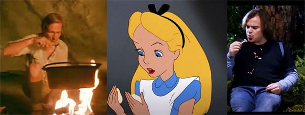 In this first film of the Lord of the Rings series, the Hobbits discover a patch of mushrooms after sliding down a hill. "It was a detour, a shortcut," Merry (Dominic Monaghan) says. "A shortcut to what?" Sam (Sean Astin) asks "To mushrooms!" Merry exclaims. As they pick them, eat a few and stash them in a bag, Frodo (Elijah Wood) hears something and they hide. A horseman rides by. Frightened, Merry tosses the bag away.